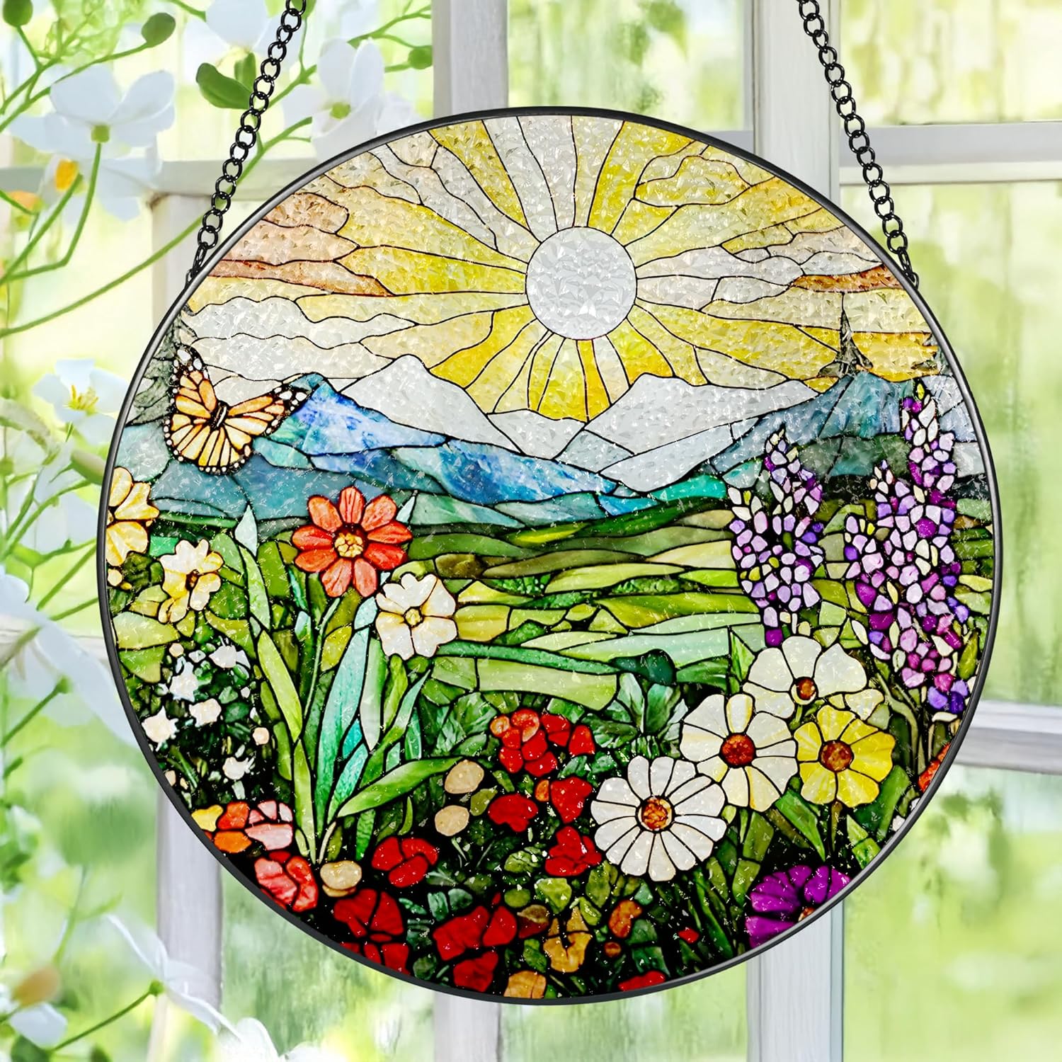 8 Inch Mountain Wildflowers Stained Glass Suncatcher, Suncatchers for Windows Hanging, Window Decor, Grandma Mom Gift for Her, Mother's Day Christmas Birthday