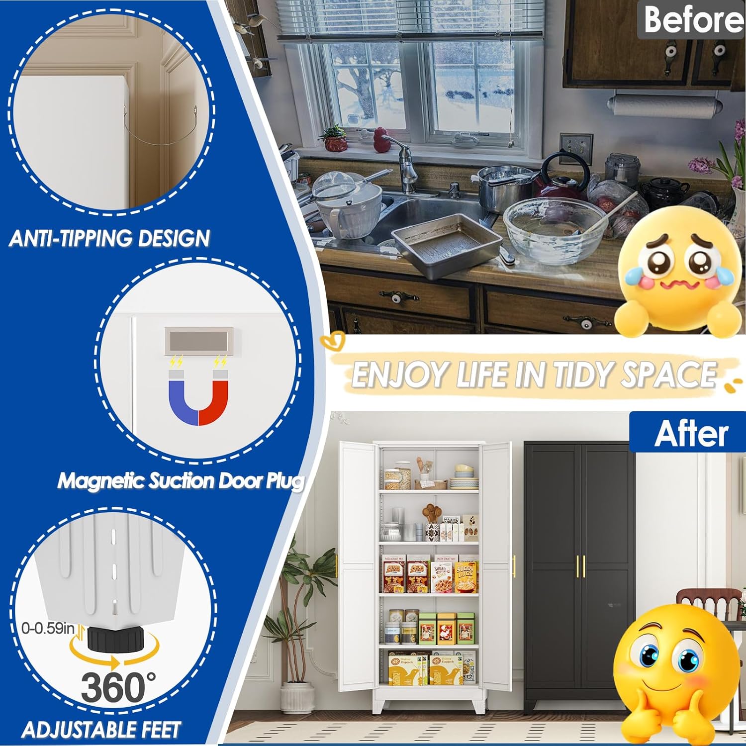 - ăâEASY Quick AssemblyăThe steel storage cabinet adopts an freestanding design, and buffet sideboard cabinet is a detachable structure as a whole. You only need a screwdriver to easily complete assembly. The cabinet with doors and shelves comes with installation instructions, and all parts are labeled to help you complete the installation faster. You can have a sturdy and stable pantry storage cabinet without spending a lot of time and effort. Suggest two adults gather together