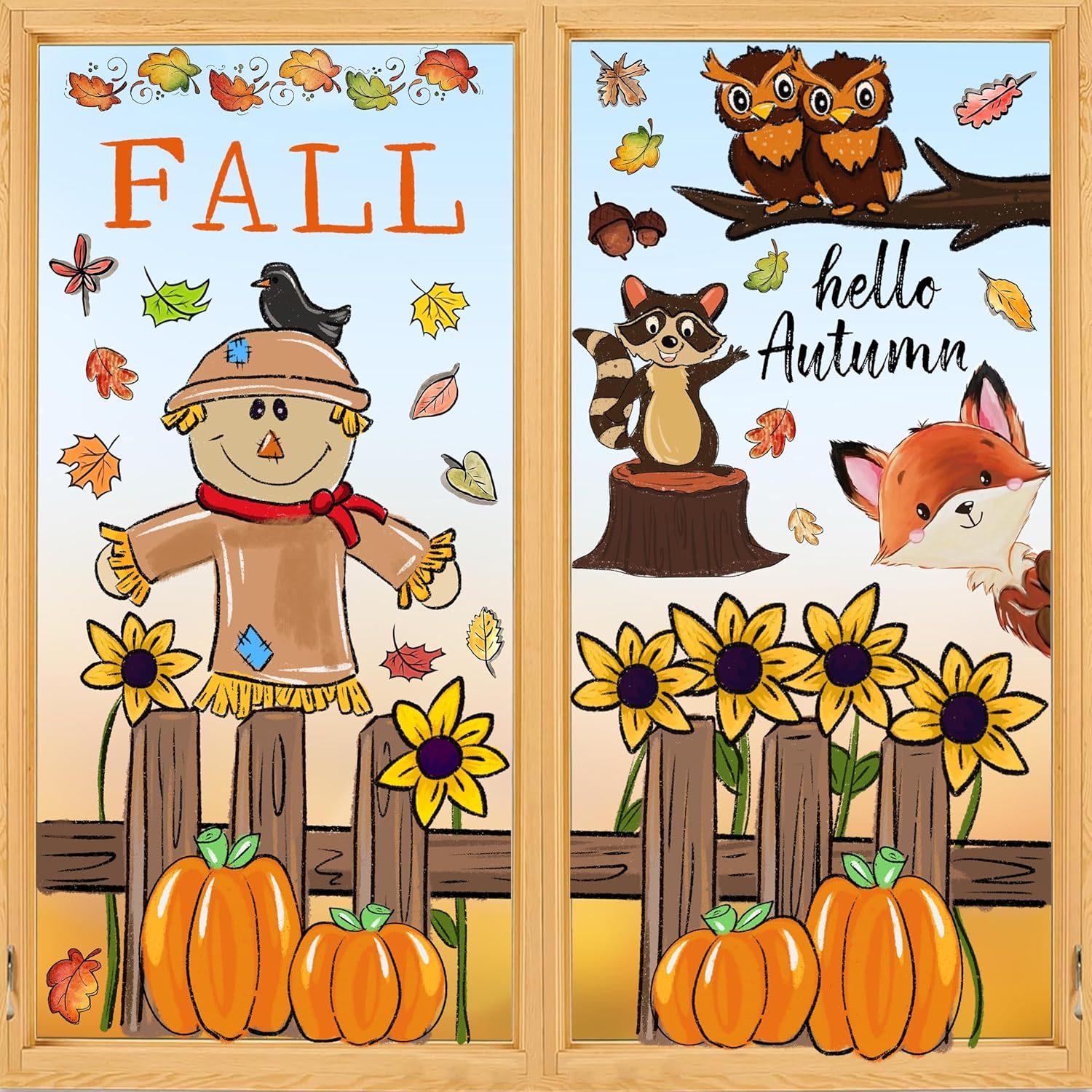 - Fall Window Stickers - This large Fall window stickers contains different Fall Watercolor Pumpkins, Maple Leaves, Scarecrow, Owl and Sunflowers, looks cute and interesting, which can help you create a warm Fall atmosphere.