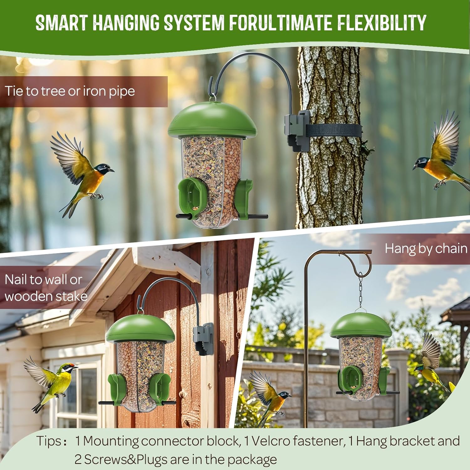LONA Bird Feeders for Outdoors Hanging – 3 Separate Compartments, 3 Feeding Ports, Weatherproof Dome & 3 Ways to Hang, Large Capacity for Cardinals/Finches (Green,Plus
