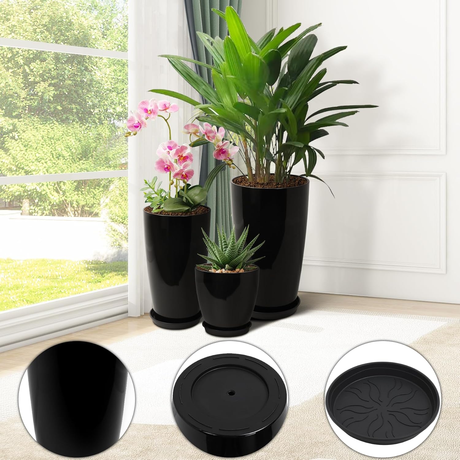 24/21/12 Inch Large Plastic Planter, Lightweight Ceramic-Look Large Flower Pots with Drain Hole & Saucers, Plastic Outdoor Planters for Garden, Patio, Balcony(Brilliant Black)