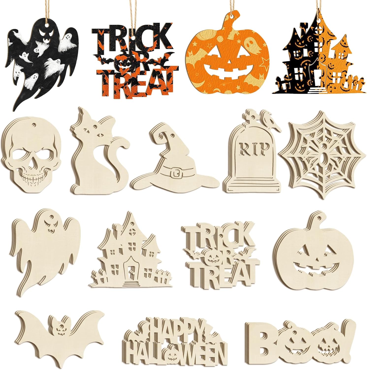 - Halloween Ornaments Includes: 12 blank Halloween wooden circles of different shapes(Skull Pumpkin Ghost Bat BOO Trick or Treat Halloween Cutouts)for DIY painting, each fall cutout contains 3 pieces. Comes with 36 braided linen cords