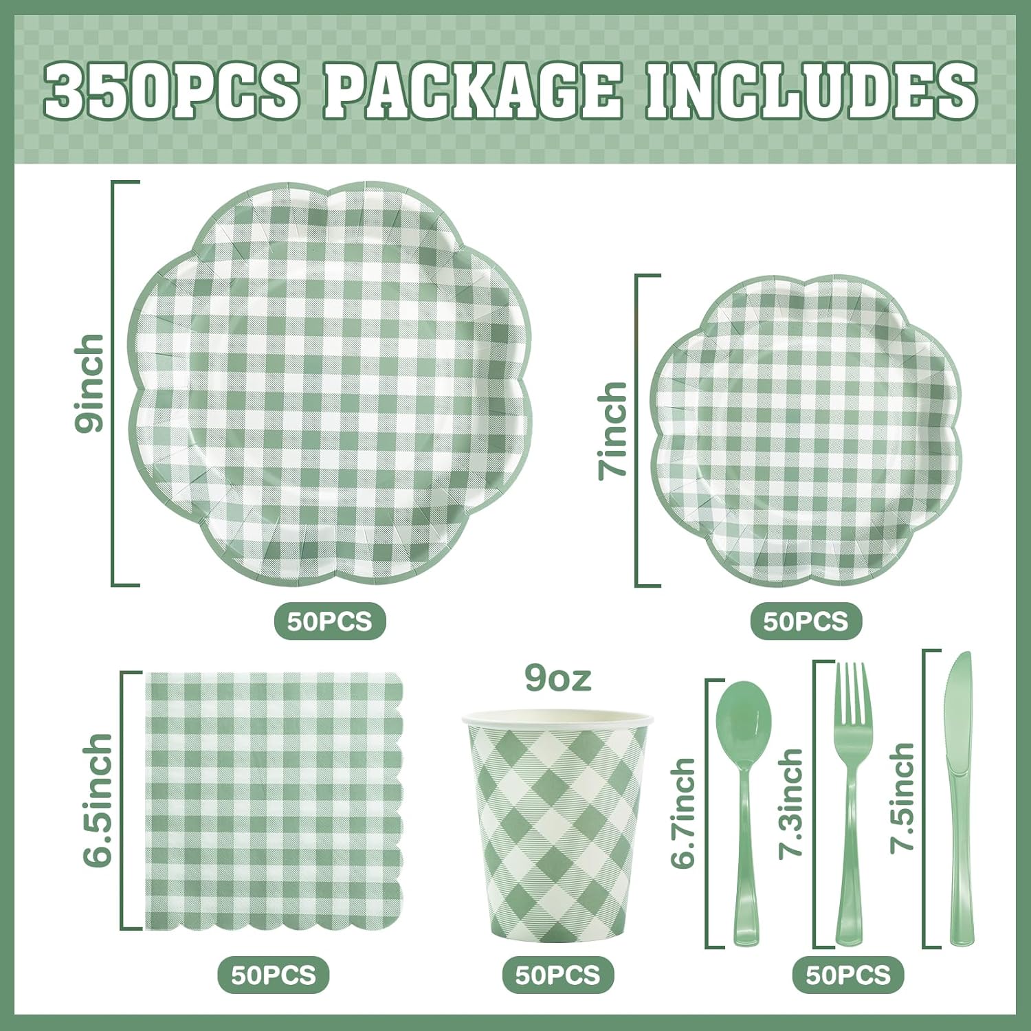 350 Pcs Sage Green Gingham Paper Plates and Napkins Party Supplies - Sage Green and White Checkered Plates Scalloped Plaid Plate for Birthday Dinner Picnic BBQ Party Decorations, Serve 50 Guests