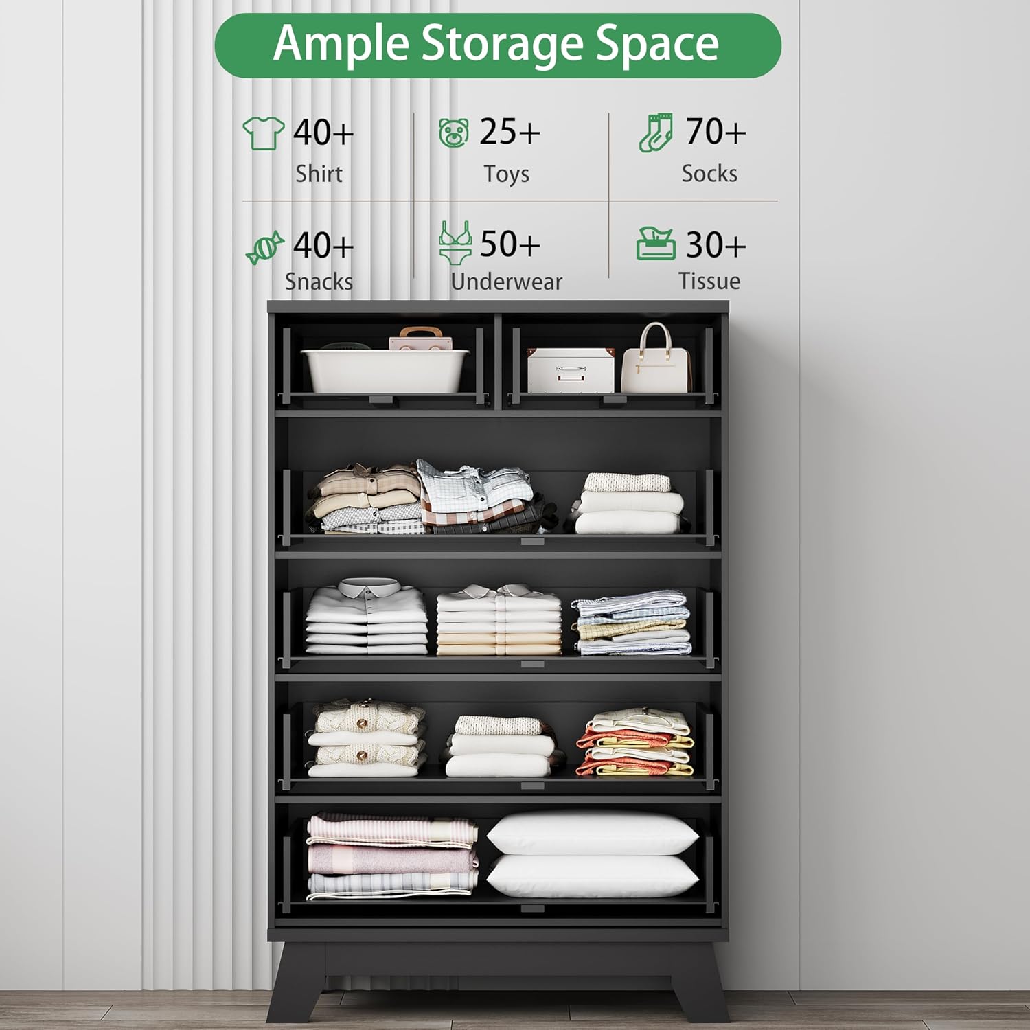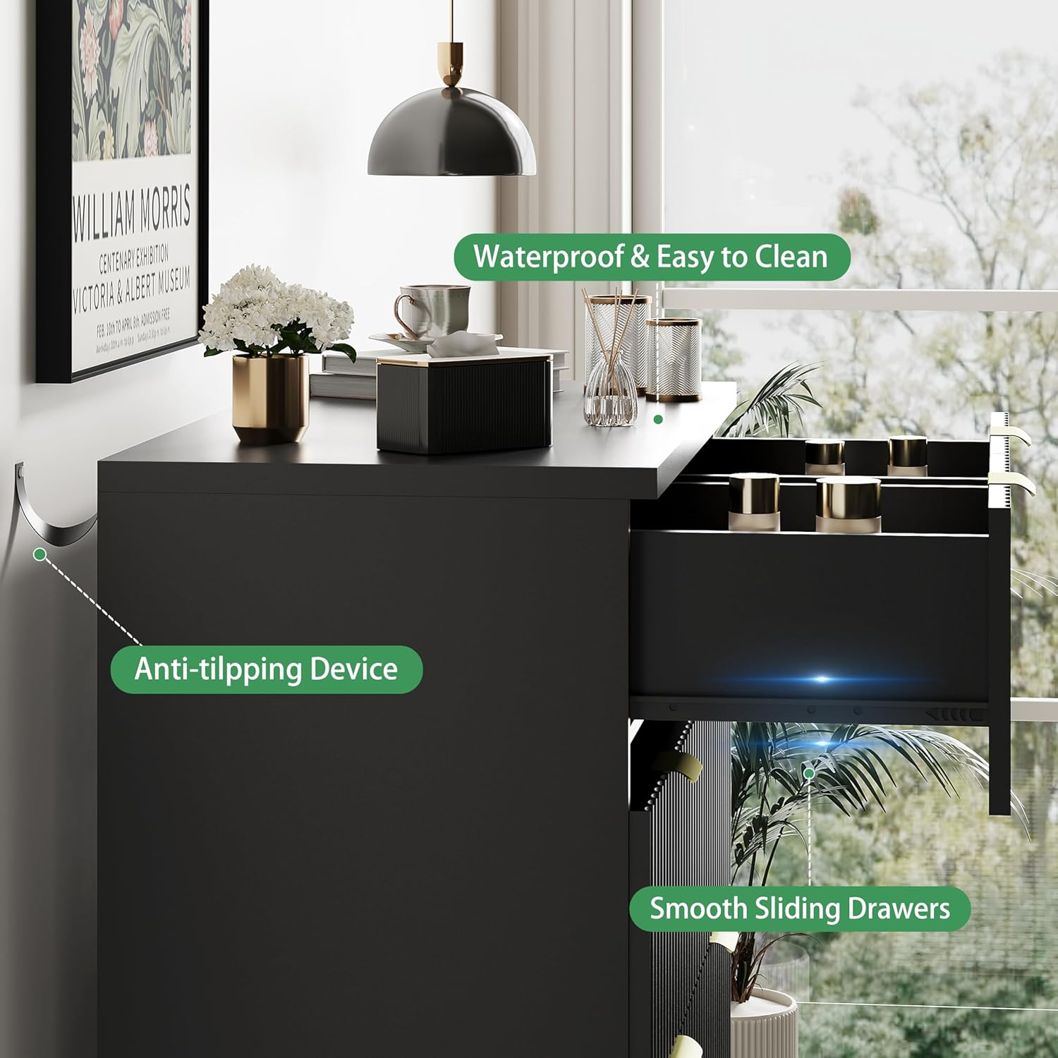 - ăModern Chic AppearanceăThe unique wave-like fluted panel enhances the texture and elegance of this bedroom dresser. The thick table top features natural wood grain that complements the black finish. The wide metal handle and splayed base legs add a modern touch, creating a personalized and distinctive appearance