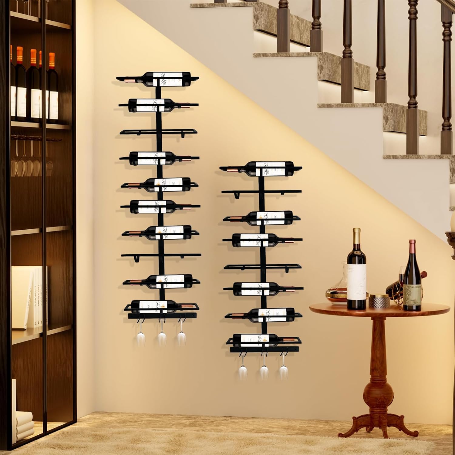8 Bottle Wall Mount Wine Rack with Wine Glass Holder, Metal Wine Wall Rack, Wall Racks for Wine Bottles Display and Storage, Hanging Bottle Organizer for Living Dining Room Wine Cellar Bar (Black)