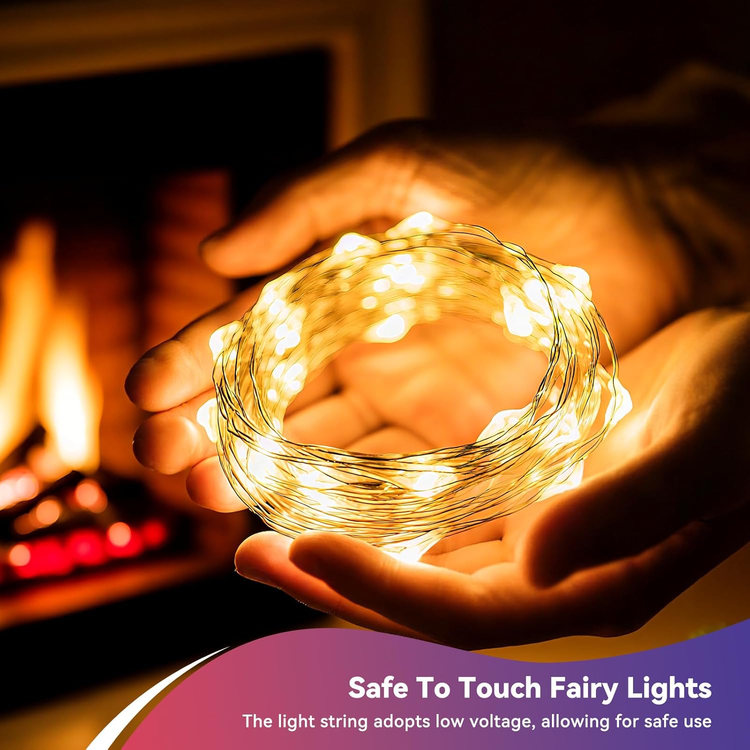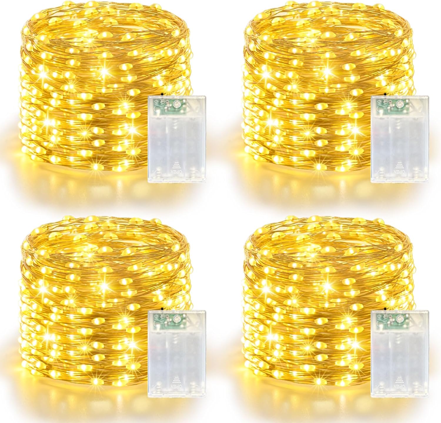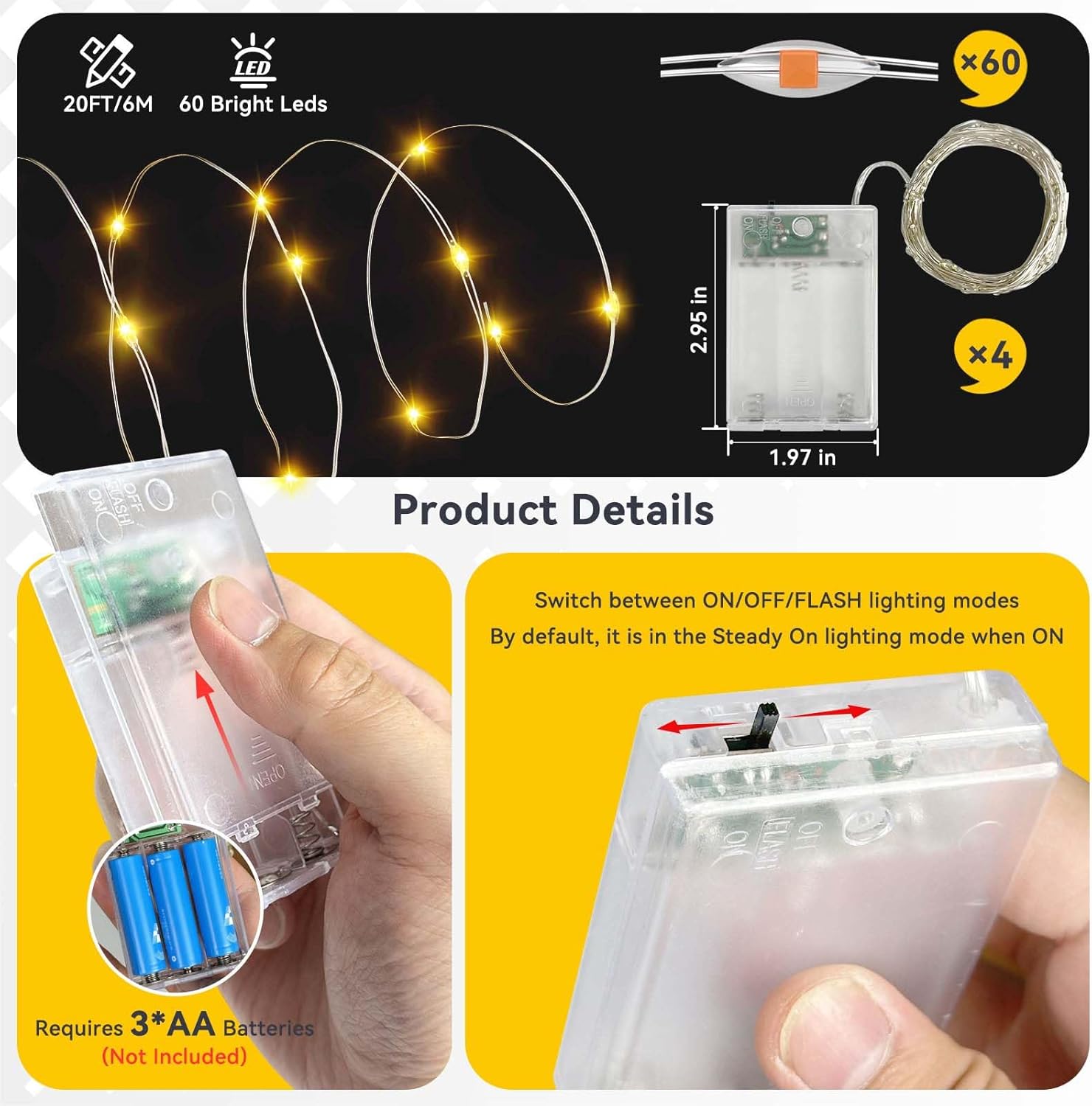 - Ultra-Bright Fairy Lights Battery Operated: Each pack includes 4 separate copper wire fairy lights, each featuring 60 brilliant LED bulbs, for a total length of 20FT. Effortlessly illuminate and decorate multiple areas like bedrooms, bookshelves, dining table centers, balconies, patios, and porchesâinstantly adding a warm, cozy glow to your holiday parties or daily home ambiance.