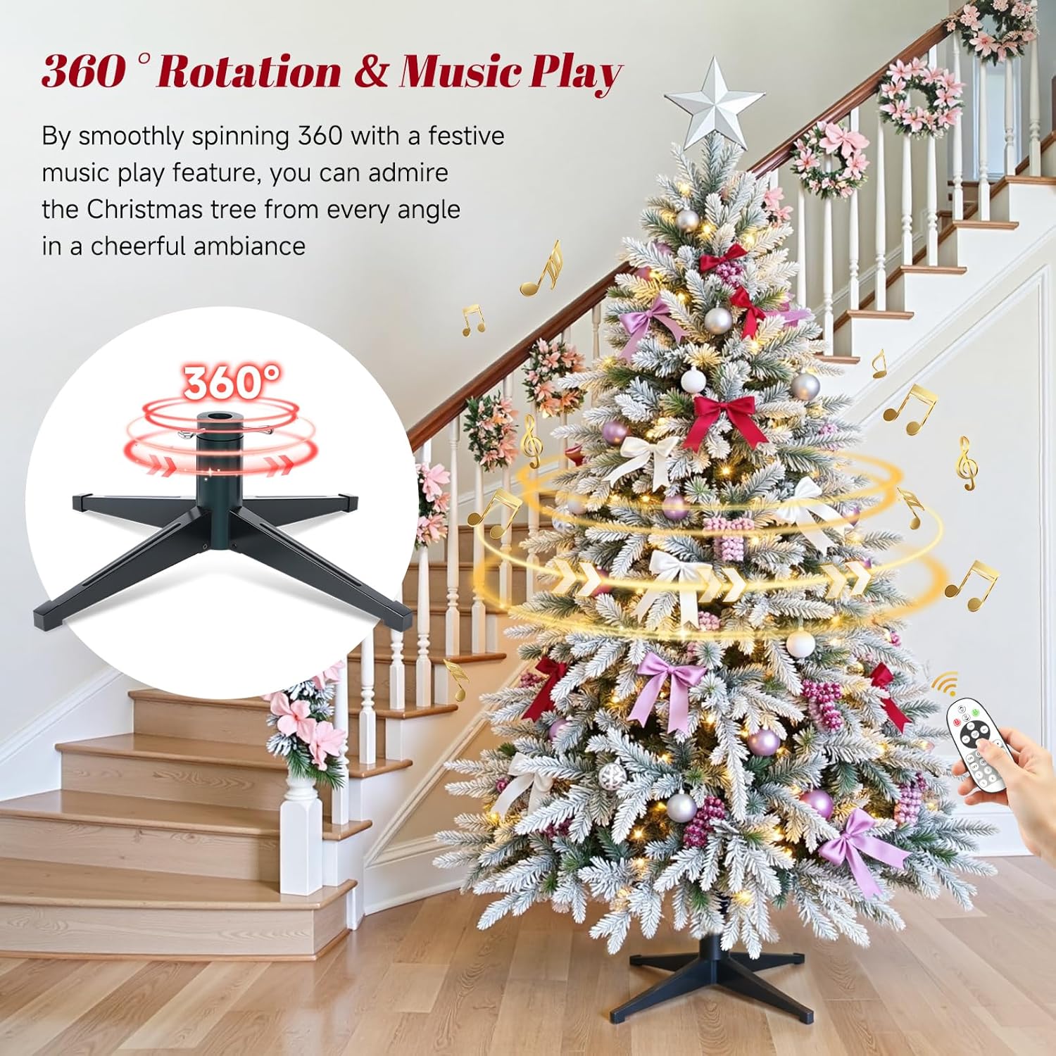- 360° Rotation & Built-in Music: The 18-inch rotating base allows the tree to gently spin around 360 degrees, showing off its beauty from every angle. Combined with cheerful built-in music, the tree plays a classic Christmas carol, creating a lively and festive atmosphere. Both the music volume and the rotation function can be easily adjusted with the provided remote to suit your mood — turn your tree into the centerpiece of your home’s holiday display.