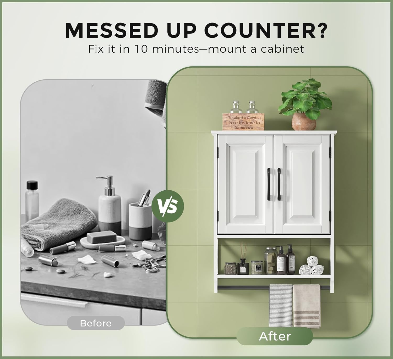 - Towel Bar and Ventilated X-Frame Design: More than just a wall cabinets—it's a functional accent. The built-in towel bar keeps hand towels within reach, while the X-frame base enhances airflow to help prevent moisture buildup and keep your bathroom storage area dry.