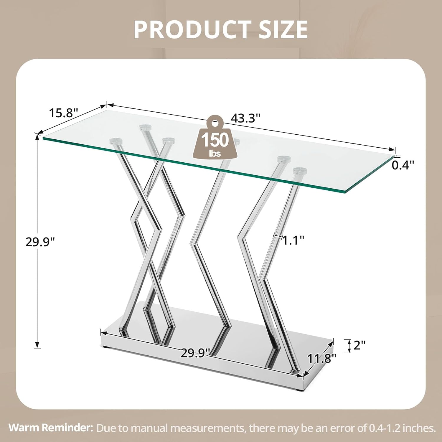 - ăPremium Tempered Glass Top for Elegance & Durabilityă - Upgrade your space with our 43.3" modern console table. Our modern glass console table features a high-quality tempered glass top increase its durability. The ultra-clear 0.4" thick tempered glass tabletop Unlike cheaper alternatives, our glass does not turn yellow over time. Whether you prefer a rustic, modern, or transitional aesthetic, this console table effortlessly blends in while elevating your interior style.