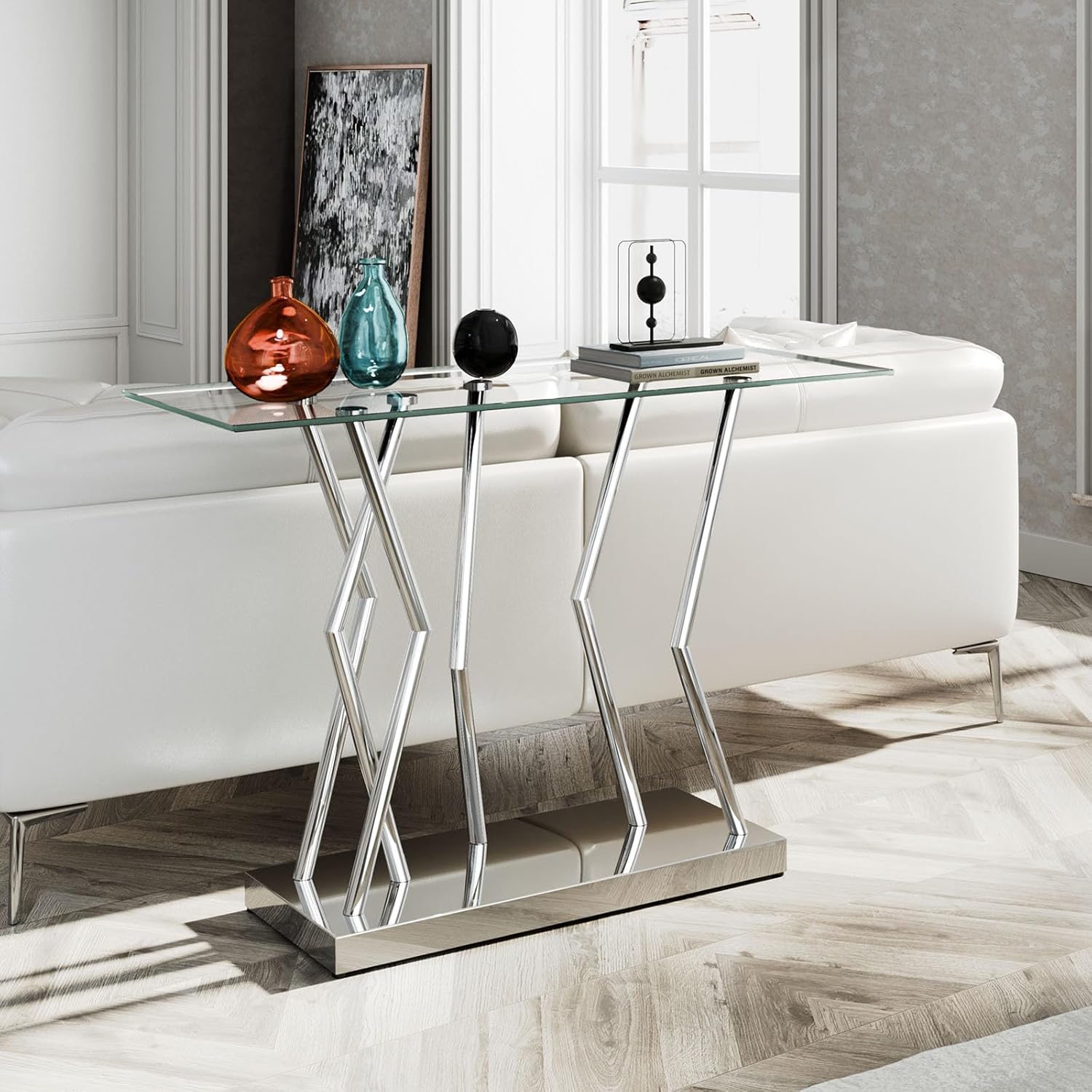 - ăMulti-Functional for Home & Officeă -Beyond its role as a chic entryway table, it serves as a sofa table for living rooms, a buffet table during gatherings, or a minimalist office desk. The neutral silver-and-glass palette blends with any color scheme, from bold accent walls to neutral Scandinavian interiors. In addition, the easy-to-clean surface makes it pet- and kid-friendly.