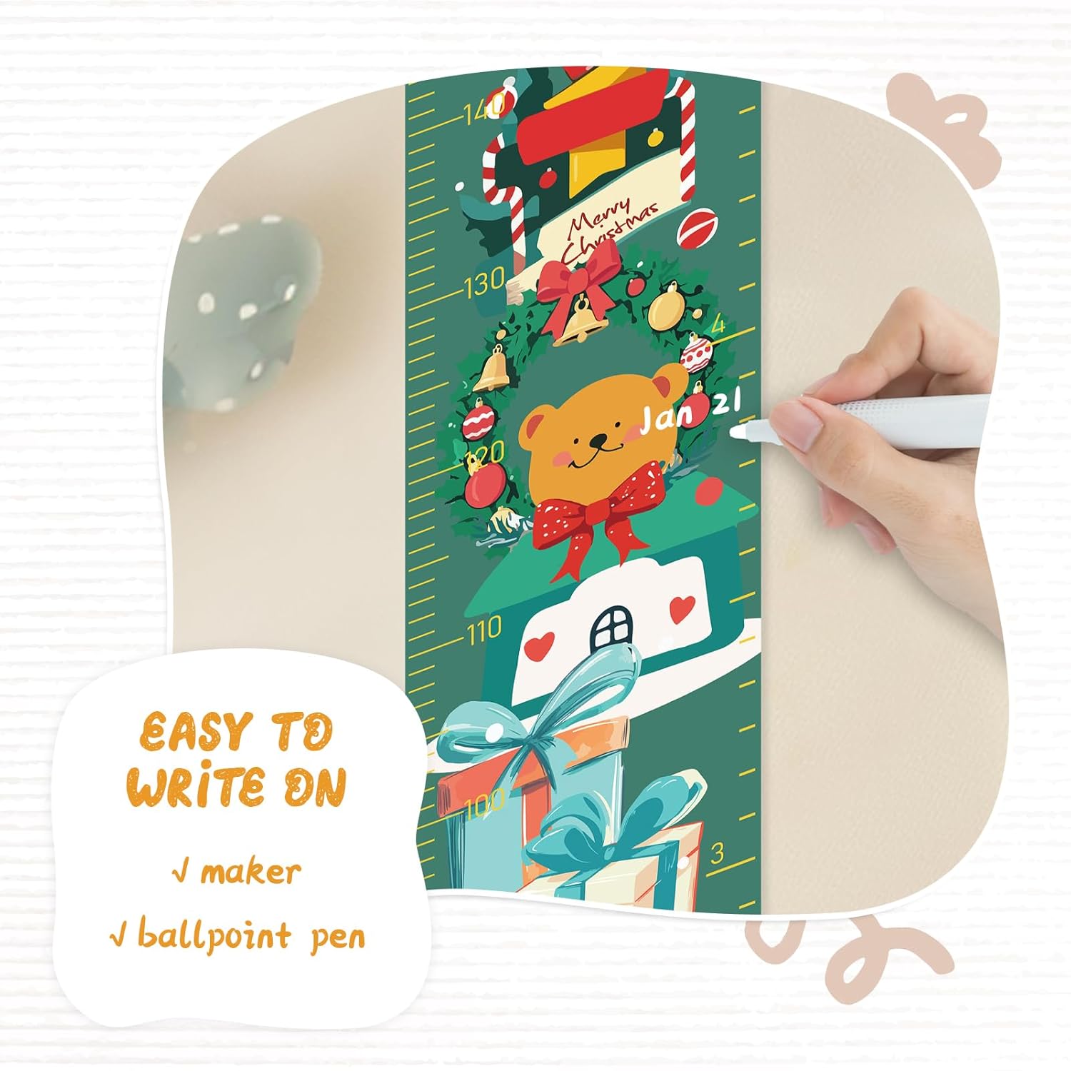 - Design: Kids growth chart with rope at the top of the chart, easy to install and removeable, foldable and portable design, easy to store, hang, roll up, transport, and save space. It boasts a material that's easy to write on, where you can use dark colored ballpoint pens and markers to track growth milestones.