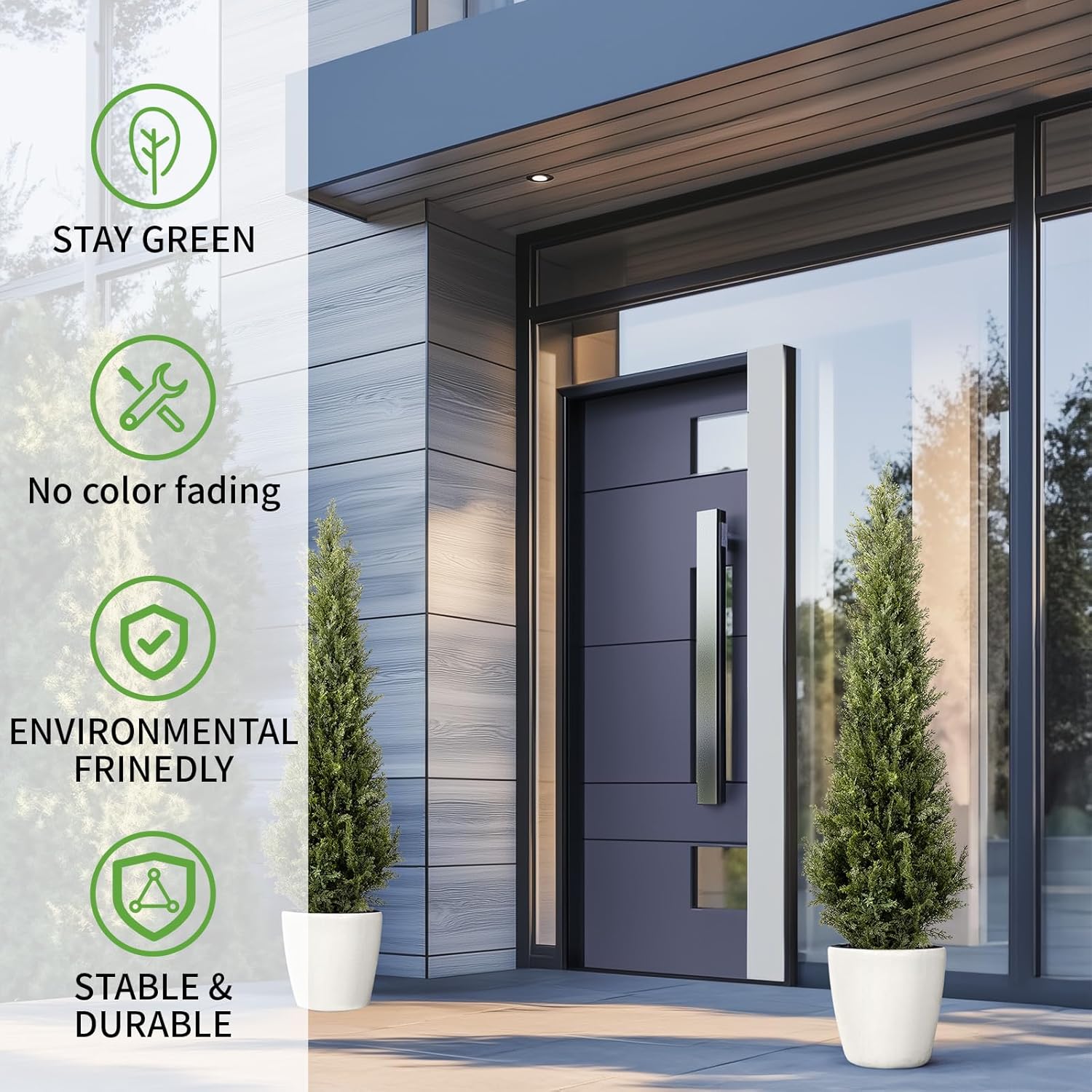 - ăMulti-Size SelectionăThese artificial topiary cedar trees have 3ft(36in)/4ft(48in)/5ft(60in)sizes, and each fake pine trees with quality black pots. Of course, to go better with the style of your house, you can put them in your other matching pots, and they will sit easily inside the bigger pots.