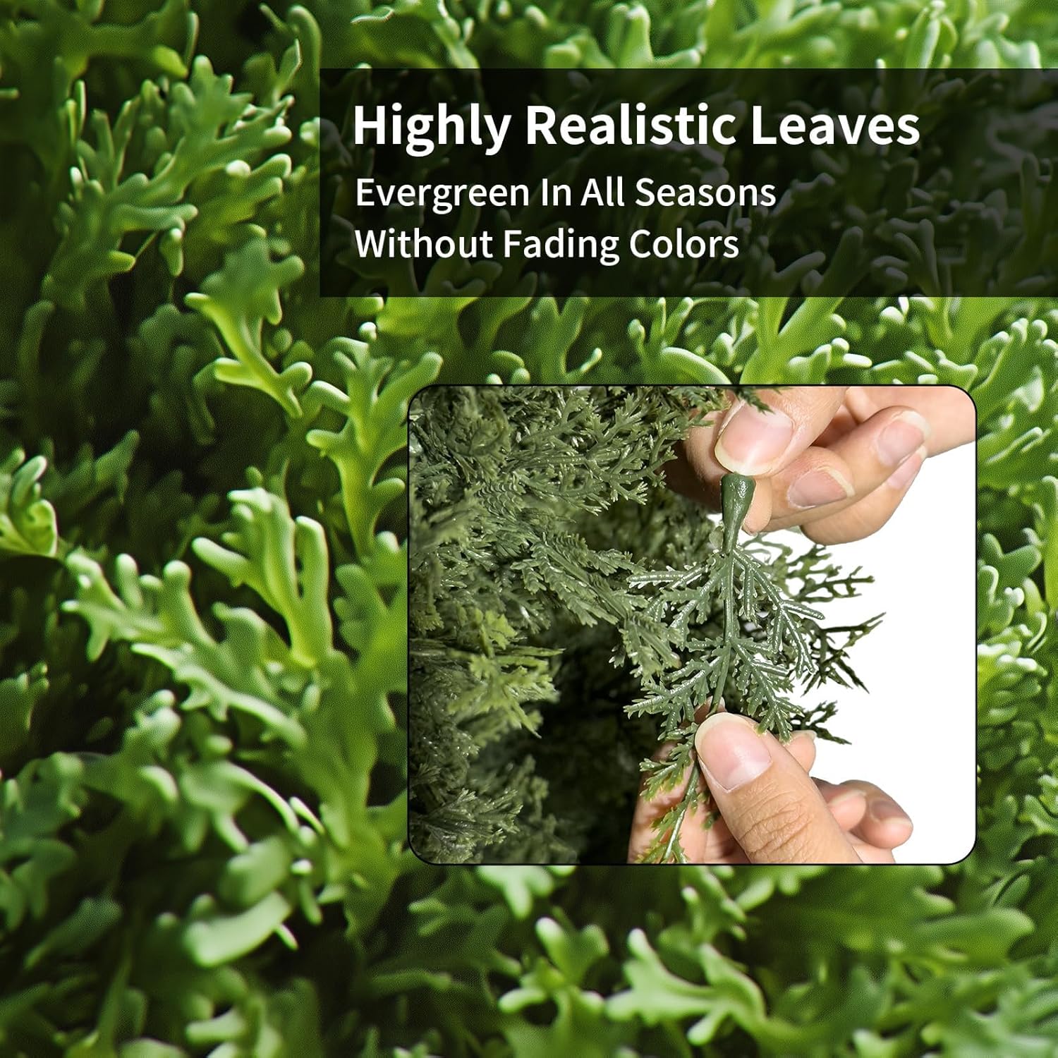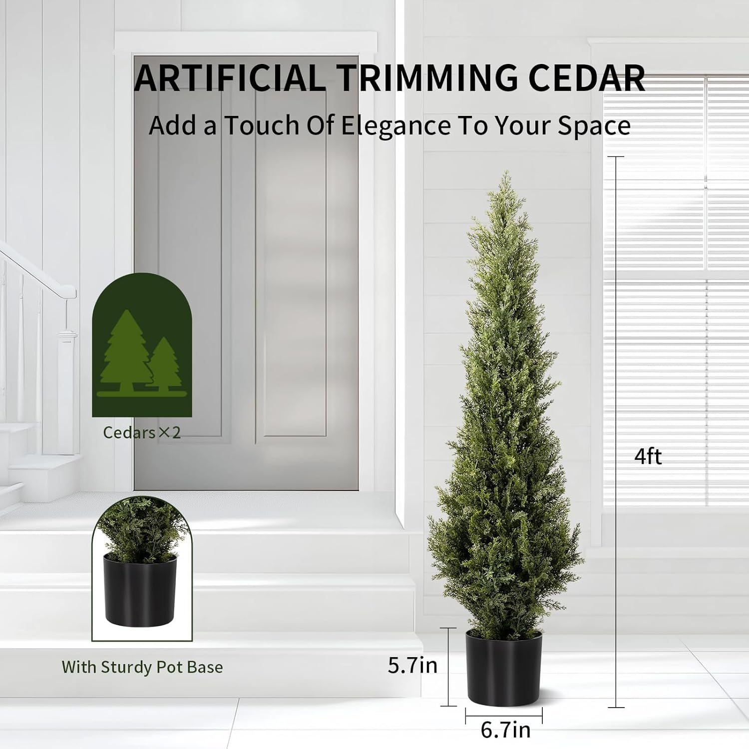 - ăMulti-Size SelectionăThese artificial topiary cedar trees have 3ft(36in)/4ft(48in)/5ft(60in)sizes, and each fake pine trees with quality black pots. Of course, to go better with the style of your house, you can put them in your other matching pots, and they will sit easily inside the bigger pots.